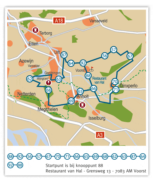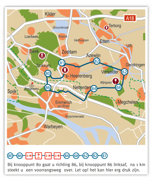Vanuit het centrum van ’s-Heerenberg richting Kasteel Huis Bergh bij de grote stenen, gaat u linksaf en volgt u de route naar knooppunt 80.